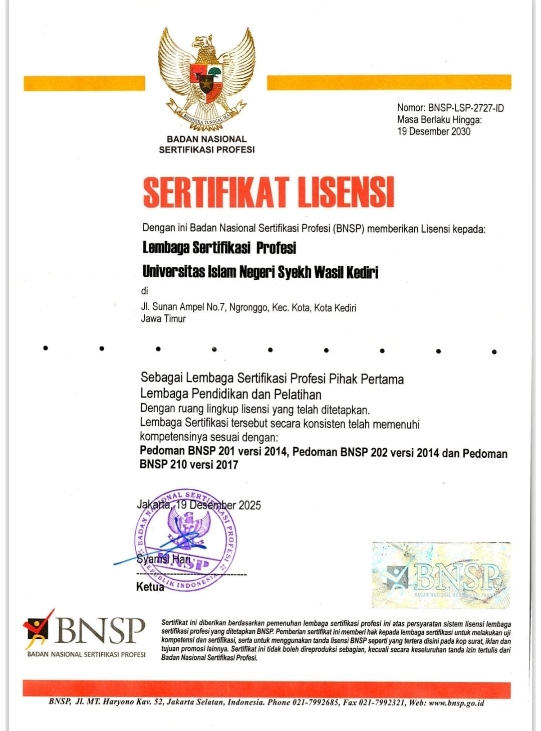 UINSW Newsroom – Lembaga Sertifikasi Profesi (LSP) UIN Syekh Wasil Kediri resmi mengantongi sertifikat lisensi dari Badan Nasional Sertifikasi Profesi (BNSP). Lisensi tersebut memberikan kewenan
